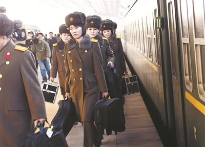 图为朝鲜牡丹峰乐团团长玄松月抵达北京站。访问团成员们在北京站走下火车。