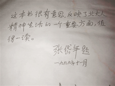 待到我请他惠赐墨宝为本书题词的时候,张岱年老先生乃凝思片刻,又征求了我的意见,终于挥笔写下了这样一句话:“这本书很有意思,反映了北大人精神生活的一个重要方面,值得一读。”还落了款,标上了时间。老先生题词用的是钢笔,字迹清朗通达,很有美感,尤使我惊讶的是,老先生的字竟然是少见的遒劲、流畅,绝不像一位年已九旬的老人所写,其力道甚至远甚过年轻人的字迹。