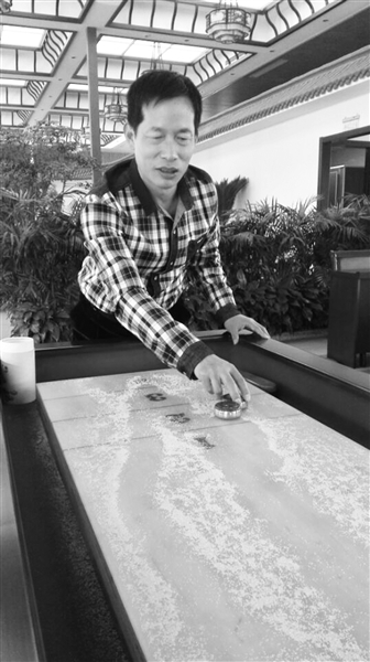 经过长期的揣摩、把握,如今,徐建华已能把自己的4个“壶球”稳稳当当地滑到球桌另一方“3分”或“4分”的计分区域位置上,这让他十分自豪。