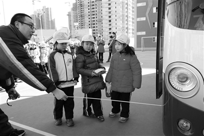 昨天,在公交客七分公司司售人员指引下,首师大附属朝阳实验小学一年级学生体验公交车到底有哪些“盲区”。学生们通过与驾驶员互动的方式,亲自测量找出车辆盲区,了解在步行和候车时应该与公交车保持的安全距离,增强学生道路通行以及候车时的安全意识。本报记者 孙妍 摄影报道