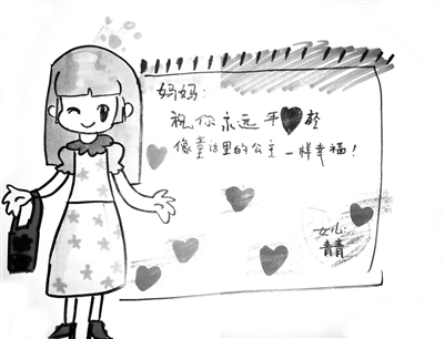 看到女儿递过来的贺卡,我心情无比的激动,这是女儿第一次送我礼物,我轻轻地把贺卡打开,贺卡是女儿亲手用彩色画笔画的,一个披着长头发的卡通女孩,穿着漂亮的长裙子,高跟鞋,手里还拿了一个画着小碎花的包。画的右边空白处工工整整写了一行字:“妈妈祝你永远年轻,像童话里的公主一样幸福。”