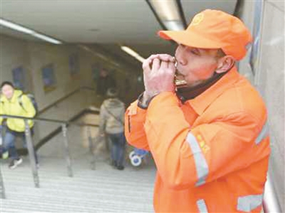 12月18日下午6时许,西安小寨地铁出入站口处人来人往。一名保洁员站在楼梯上,手捧一把口琴,旁若无人地吹起《闪闪的红星》。一曲完毕之后,又开始了下一曲《三大纪律八项注意》。口琴声音响起时,他会闭上眼睛,仿佛陷入对往事的回忆中。他叫王养刚,63岁,在小寨区域从事保洁员工作10年了,喜欢工作间隙吹口琴,不少人为他点赞。他的儿子3年前意外离世,口琴和音乐成了他的一种寄托。他说:“希望我的快乐能感染到别人”。