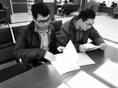 市总工会法服中心的杨雪峰(左一),为职工出庭辩护前准备证据材料。