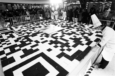 昨天,一个面积25平方米,重达1吨的巨型二维码蛋糕在来福士广场与百姓见面。在新年来临之前与市民一起分享元旦的喜悦。据制作蛋糕的工作人员透露,这个使用面粉约为280公斤、鸡蛋280公斤、巧克力及奶油110公斤、水果80公斤制作的巨型二维码蛋糕是商家在新年来临之前,为新老会员精心准备的新年礼物,希望大家在逛街的同时还能得到一份甜蜜的礼物。本报记者 孙妍 摄影报道