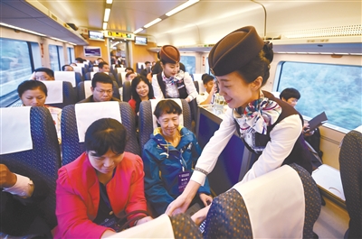 12月30日,海南环岛高铁的列车员为乘客发送饮水和水果。当日,海南环岛高铁西段开通运营,与2010年12月开通运营的海南环岛高铁东段实现连通,标志着全球首条环岛高铁全线贯通,旅客乘高铁环游海南岛成为现实。海南环岛高铁西段北起海口市,南至三亚市,经过澄迈、临高、儋州、昌江、东方、乐东6个市县,全长345公里,设计速度200公里/小时,对加快形成海岛“三小时经济圈”、推进国际旅游岛建设具有重要意义。
