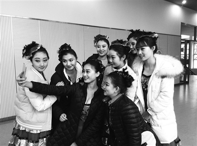 丰台镇教育集群昨天举办“成长的足迹”专场演出,首师大附属丽泽中学、丰台二中、丰台一小等集群成员校的师生表演了管乐合奏、合唱、相声、舞蹈等节目。图为总后六一幼儿园的教师候场时兴奋地自拍。 本报记者 任洁 摄影报道
