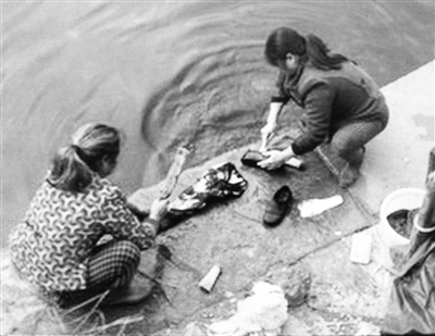 在我小时候,经常能看到大人们这样的劳动场景。河面宽阔,水流潺潺,清澈的河水尽看河底,甚至连水草中游动的鱼儿,都被看得清清楚楚。女人们像奔赴前线一样,蹲在河床边,拉开阵势,每人找一个洗衣的位置,把脏衣裳一件一件先浸泡在水里,再用石头压住上边一角,防止衣裳被水冲走。洗的时候,把要洗的衣裳从水中捞上来,用肥皂在上边轻轻抹上几处,放到水边的砖头块上,用手抡起木头棒槌,对准湿衣裳一下一下狠狠锤砸。一边砸,一边不停翻动衣裳,一边还不误嘻嘻哈哈谈笑风生,家长里短无所不及。一些性格外向的女人,时不时会开些玩笑,羞得一些内向的女人,白白的脸蛋儿一下子红到耳朵根儿,纷纷相互撩起“水仗”来,把一串串银铃般的笑声撒到水面上。