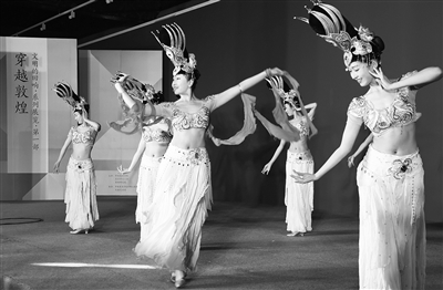不出京城,可观敦煌。飞天壁画、戏台藻井、绚丽乐舞……1月12日下午,由北京市总工会联合中央美术学院、敦煌研究院联合主办的“文明的回响——穿越敦煌”在太庙艺术馆启幕。作为联接古今、跨界综合的视觉艺术大展,300多件多元形态的古今艺术品,为观众开启了一场围绕敦煌艺术和丝绸之路文明展开的跨越地域、穿凿古今的视觉艺术之旅。本次展览展期将持续至3月16日。