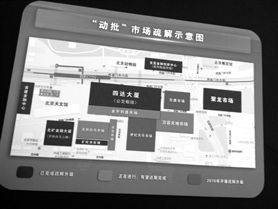 发布会上,孙硕拿出了一块“动批”市场疏解示意图。示意图上,“已完成疏解升级”的商场标注成了蓝色,“正在进行有望近期完成”的商场标注成了橘色,而“2016年开展疏解升级”的商场标注成了红色。