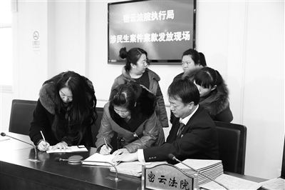 本月12日上午,密云法院举行执行案款集中发放活动,为案件当事人发放案款共计47万余元。