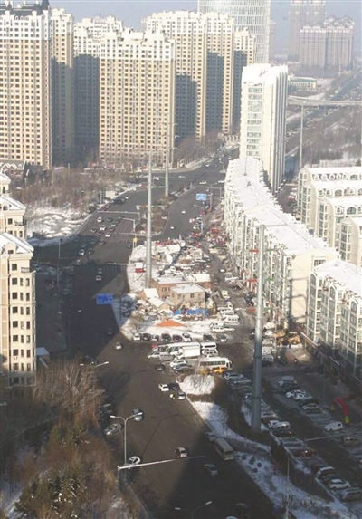 2016年1月2日,黑龙江哈尔滨上江街和群力第七大道附近有一处平房一直未动迁,宽敞的马路到此处变成狭窄街路,12车道变成5车道,形成交通梗阻,影响车辆通行。据说,该平房在此处已有10余年了,导致道路无法全线贯通,也造成了安全隐患,当地居民盼着它们早日能拆掉。(1月4日腾讯网)