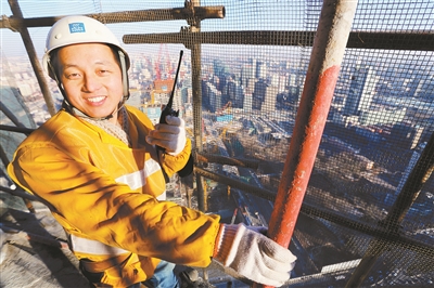1月6日,全国劳模祖炬,北京市劳模刘可晶、罗秉臣、徐连生、陆岗5名劳模和志愿者们攀爬上了260余米高的国贸中心三期B54层,冒着严寒为正在当今北京在建最高建筑的农民工拍照,记录下为北京地标建筑辛勤工作的农民工们笑容绽放的瞬间。