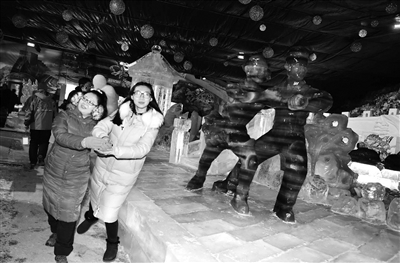 高山滑雪、雪车雪橇、冰壶冰球……上周末,一个个与冬奥项目有关的冰雪造型,栩栩如生地亮相在延庆第三十届龙庆峡冰灯艺术节,游客可以在这里欣赏到精美的冰壶、速滑等冰雪艺术品。据了解,本届冰灯艺术节占地面积20万平方米,共350组花灯、2000棵树灯、350件冰灯、200件冰雕和100件雪雕,把夜晚的龙庆峡装扮成奇幻亮丽的冰雪乐园。图为市民模仿花样滑冰。
