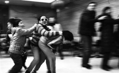 “双手搭在前面小朋友的肩上,我们向前走,为前面的小朋友捏捏肩,按摩按摩……好,立定,手放下,转身,咱们再给另一边的小朋友捏捏肩……”随着教练的口令,进入寒假的孩子们开始了第一次交流。