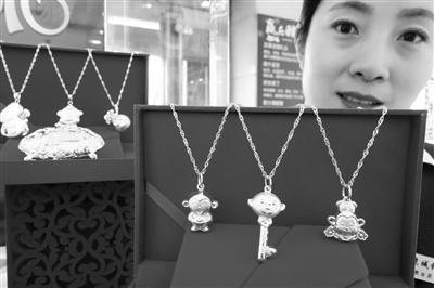 随着农历猴年的临近,京城“压岁金”市场也持续升温。国华商场黄金部经理介绍:近日选购黄金饰品的顾客与日俱增,“现在金猴吊坠销售很火爆,尤其3-6克左右销售最好,价格一般在1000元上下,款式也很全,有上百种供顾客挑选。”本报记者 孙妍 摄影报道