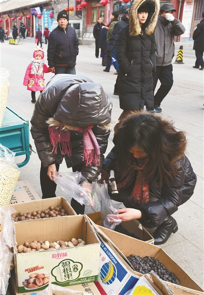 来延庆区永宁古城大集购年货的人们笑容满面。往年到了年根儿,城里人扎堆儿往超市跑。今年,很多白领结伴下乡赶集购置年货。缘由是到远郊区县能“一箭双雕”,在游玩的同时,还可以买到一些很难买到的山货。