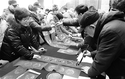 本报讯(记者 边磊)2月2日下午,交道口街道总工会携手北京东方中国诗书画院,在南锣鼓巷社区联合工会,举办了书法家挥笔送祝福活动。北京东方中国诗书画院副院长雷显平、杨秀祝、郑家喜等7名书法家现场挥毫泼墨,书写一幅幅精美的春联和福字。
