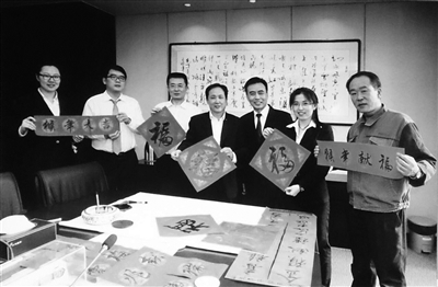 在新春佳节即将到来之际,北汽集团开展了多方面的慰问劳模、星级司机、困难职工活动。图为在集团联欢会上,职工艺术家、公司员工马锐挥毫泼墨为金牌员工书写春联和“福”字。