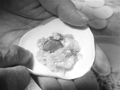 我的家乡有过年包饺子放硬币的习俗,为的是讨个吉利。谁吃到包着硬币的饺子,就预示着他这一年会有好运。
