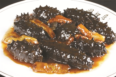 葱烧海参是同和居的镇店名菜。这道菜必须选取海参干货,采用同和居传统的泡发之法,要求不软、不碎、富有弹性、无腐蚀、无虫蛀、刺多且匀,不含火碱。为了让这道菜保持始终如一的品质,同和居在寸土寸金的经营场所之中,特地建立了一间海参涨发间,店里所用的全部海参,都要这里的专业师傅亲手发制。同和居一直保持传统的葱烧海参烹饪方法,讲究色泽光亮,质地柔软滑润,葱香四溢。烹制时,海参配以山东章丘大葱的葱白中段,海参软嫩鲜香,软刺的周围裹着一层薄薄的靓汁,入口即化,佐以焦黄葱段的浓香,爽口提味,令人食后难以忘怀,成为席间的重要养生佳肴。
