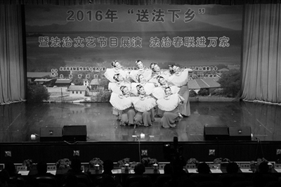 春节期间,市司法局、昌平区司法局等有关部门在昌平区小汤山镇太阳城社区联合举办“2016年‘送法下乡’暨法治文艺节目展演法治春联进万家活动”,受到当地村民的欢迎。这次展演的优秀法治文艺节目是从2015年12月昌平区举办的优秀法治文艺汇演节目中选拔的,有评戏《群租房危害大》、相声《平安成长手牵手》、数来宝《信不信由你》、杂技《聪明反被聪明误》等一些群众喜爱的法治文艺节目。