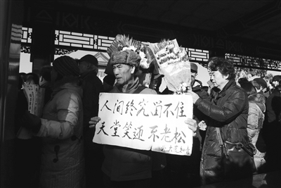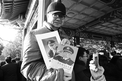 春寒料峭,挡不住人们对老艺术家的追怀。群众中有人高举牌子:“完成阎肃先生遗愿 告慰阎老在天之灵。”这位来自江苏徐州的中年人叫张浩,是一位立志搜集拥军歌曲的徐州市拥军模范,阎老曾勉励过他,他说,自己一清早便从旅馆中出发,来到八宝山排队为阎老送行。