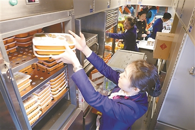 列车乘务员的工作也很辛苦,她们每个人要负责4节车厢600名乘客的服务。“帮助乘客上下车搬运行李、提醒报站、验票、送水服务一天下来,我们要在车厢来回走10000多步,弯腰600多次。”乘务员李怡说。