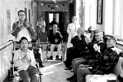 2月23日,丰台区康助护养院的义工辅导老人们学做护养院自创的“走廊健身操”。老人们不仅在阳光明媚的走廊里锻炼身体,还可以相互聊天交流,愉快度过每一天。