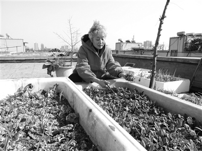 为了保持“菜园”的“绿色”品格,菜生了虫也不喷药,老伴儿搬个小凳,坐那儿用手逮,一坐就是大半天儿;苗儿弱了也不施化肥,老伴儿捡来塑料袋,把烂菜叶、水果皮,装起来沤成肥,埋在“地”里。就这样,老伴儿的这个楼顶“菜园”,取得一次次收获,让快意也注满家人心田。