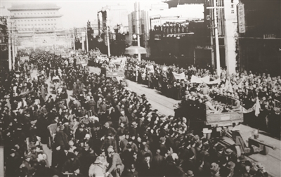平津战役是解放战争中具有决定意义的三大战役中的最后一个战役。1949年1月31日,平津战役胜利结束,人民解放军进驻北平城,北平宣告完全解放。3月15日,中共中央由西柏坡迁到北平。图为人民解放军举行入城仪式.