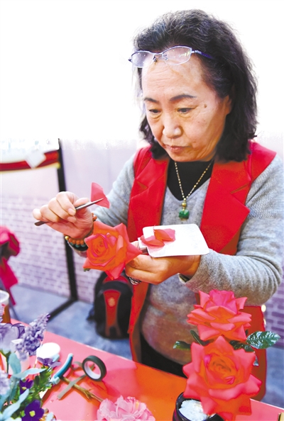 在展演活动中,很多国际友人围在她的桌子前,细细观赏中国传统民间工艺绢花制作流程,看着她左手带着酱子板,把握好的花瓣整齐地码放在上边,用红纸包好的纸骨朵往上一层层粘花瓣。转眼间一朵以假乱真的红玫瑰出现在他们面前,他们觉得非常神奇,非常有意思,连连竖起大拇指说:“Pretty good”,认为中国的民间艺术太美妙了!