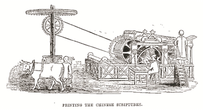 以牛做动力旋转印刷机,在晚清时期看来很新奇。参观尤不满足,于是有文人作出“竹枝词”咏叹:车翻墨海转轮圆,百种奇编宇内传。忙煞老牛浑未解,不耕禾垄耕书田。图为晚清的牛力印刷机插画。