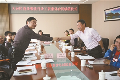 在去年10月份举行的大兴区服务工会工资集体协商会议上,38家餐饮企业签订了工资专项合同和确认书。协商过程中,劳资双方全体代表结合企业实际,从不同角度开展热烈讨论。许多企业介绍了开展工资集体协商工作和工会工作时的先进经验,来子海鲜在各个节假日均为员工发放礼品、老员工有员工奖以及公司经理定时与员工聊天,为职工带去了人文关怀;日月星辰为职工设立店龄津贴,以留住企业人才,促进共同发展;辣妹风情酒楼实行企业营业额与职工工资挂钩机制,让职工共享企业发展成果,降低员工的流失率……