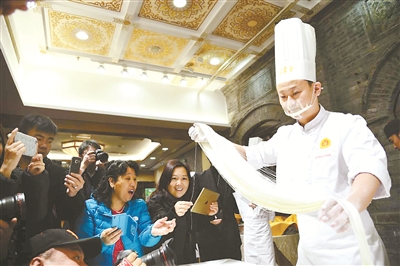 3月10日是农历二月初二,也是我国传统的龙抬头节。当天,全聚德前门店正在举办精彩的现场“抻龙须”表演,以辞旧迎新,祈求丰年,为到店的消费者迎个好彩头。据了解,现场抻成的龙须面是制作国际金奖特色面点全聚德龙须饼的主要原料。全聚德龙须饼曾多次获得中外烹饪大赛金奖,并且多次作为全聚德经典菜品,在海内外烹饪技艺交流活动中进行展示表演,经常作为接待海内外贵宾的面点之一。