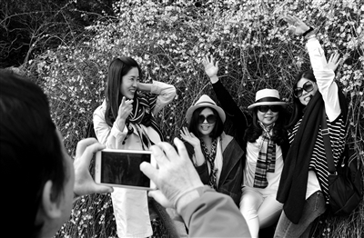 迎春花的盛开预示着春天的到来。随着天气的一天天转暖,市民纷纷走出户外踏青赏景。图为北海公园的美景吸引了众多市民前来游览拍照。