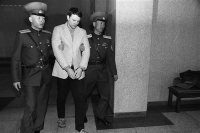 图为3月16日,在朝鲜首都平壤,美国大学生瓦姆·比尔出庭受审。