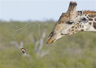 近日,一只倒霉的牛椋鸟很显然在一个错误的时间出现在了错误的位置,结果被长颈鹿的一个大喷嚏弄了一身口水。当时,长颈鹿正在水坑边喝水,而牛椋鸟正在清理它的耳朵,结果它突然打了一个大喷嚏,把小鸟的用餐时间变成了淋浴时间。