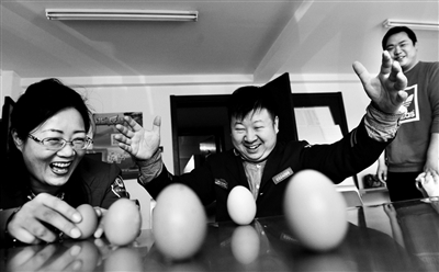 据史料记载,“春分”立蛋的传统起源于4000年前的中国,当时是为了庆祝春天的来临。“春分到、蛋儿俏”的说法一直流传到现在。昨天正值“春分”,公交特9路内环车队就组织了一场工间立鸡蛋比赛,跑一圈车回来的司售人员,人人拿个鸡蛋,轻轻放在桌上,看谁能立住。本报记者 于佳 摄影报道