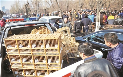 3月20日,辽宁沈阳,被收缴的鸟笼及捕鸟器具装满了一辆皮卡。当天,在沈阳市林业局野保站与沈阳市森林公安局联合开展打击非法鸟类经营市场专项行动中,工作人员共解救黄眉鹀、黑头蜡嘴雀和云雀等辽宁省重点保护野生鸟类100多只,抓获犯罪嫌疑人1名。