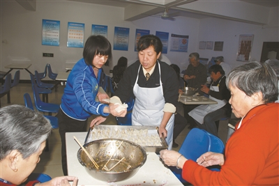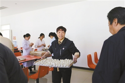 包饺子是每次看望老人的重头戏。早上9点,助老小组的10名成员全数到齐,大家在敬老院的食堂开始干活儿。擀皮儿、和馅、包饺子……每一步都有专人负责,像流水线一样包地有条不紊。这个时候,也是老人们找“儿子”、“女儿”说知心话的时候,年纪大的、手脚不方便的老人就坐在的哥的姐旁边。有的老人还搭把手帮着一起包,大伙儿有说有笑,的哥的姐给老人们讲运营时的见闻,更多的是老人们在说,前几天下棋赢了几盘呀,老姐妹一起排了一个小合唱呀,两个小时包饺子的时光,敬老院的小小食堂里欢声笑语,就像过年一样。