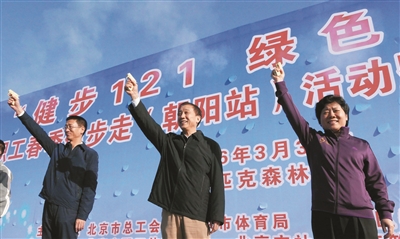 昨天上午8点,“健步121 绿色好生活”2016年首都职工健步走(朝阳站)暨北京市民健康走跑系列活动在奥林匹克公园举行。随着发令枪一声鸣响, 来自全市各行各业的3000多名职工开始了近10公里的健步里程。市人大常委会副主任、市总工会主席牛有成,市总工会、市体育局、朝阳区委、区政府相关领导参加了此次活动。