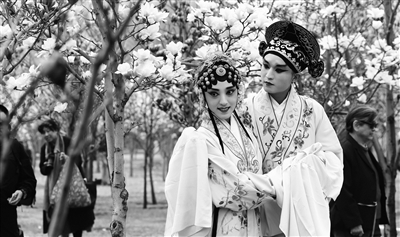 昨天,在北京国际雕塑公园内,中国京剧艺术网的昆曲演员为游园的市民表演昆曲名段。当日,该园的第十三届玉兰文化节拉开帷幕。活动期间,市民可以在玉兰树下听古琴雅韵、唱戏曲名段、拍玉兰春景。本报记者 陈艺 摄影报道