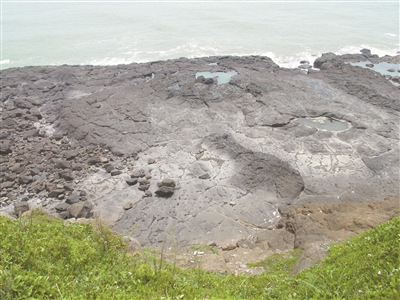 当我站在全国独一无二的火山熔岩景观——福建漳州火山岛熔岩平台上,不禁被熔岩的壮美所震撼:火山喷发形成的莲花宝座像一朵盛开的荷花,中间的喷气口远看像嫩小的莲蓬,串珠状火山喷气口像一颗颗晶莹剔透的黑珍珠。黑色的礁岩和白色的海浪花相映,曾经的沸腾与冷却在这里体现得完美无缺。身旁是海浪在歌唱,一排排的白浪向你涌来,惊涛拍岸,场面甚是壮观。