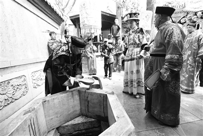 昨天上午,八大处公园举行了盛大的龙泉庵古泉井开井仪式。当天,身着龙袍、头顶皇冠的“皇帝”带领众嫔妃,祭拜龙王后,亲自打开了古井,取出山人泉水品饮。八大处公园负责人称,龙泉井是目前西山仅存的一口活水古泉眼,经化验泉水为天然高锶矿泉水,清澈甘洌,是泡茶的上等水。每年工作人员都将对井进行一次“清扫”,举办盛大的开井仪式。本报记者 陈艺 摄影报道