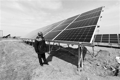在山西省大同市采煤沉陷区光伏示范基地南郊区南羊路10万千瓦项目建设工地上,一位工作人员在查看光伏太阳能板安装情况。该项目2015年10月开工,建设在“采空村”南羊路村上,今年6月底将并网发电。大同市是我国北方重要的能源基地,长时间、大规模、高强度、粗放式的煤炭开采造成沉陷区面积达1687平方公里。近年来,当地政府针对采煤沉陷区的问题,实施搬迁并探索搬迁后治理方案:一方面,在受损较为严重的乡镇进行试点搬迁,建设采煤沉陷安置区,实施整村异地搬迁安置;另一方面,利用当地丰富的光照资源,在采煤沉陷区无法耕种的闲置土地上建设光伏发电基地。随着搬迁治理工作的全面展开,越来越多的“采空村”村民告别采煤地质灾害的困扰,开始新生活,而因搬迁留下的闲置土地也得到了有效利用。新华社发