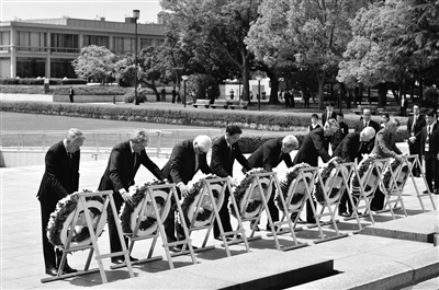 4月11日,出席七国集团(G7)外长会的法国外长艾罗、意大利外长真蒂洛尼、德国外长施泰因迈尔、日本外相岸田文雄、美国国务卿克里、英国外交大臣哈蒙德、加拿大外长迪翁及欧盟外交和安全政策高级代表莫盖里尼(从左至右)在日本广岛和平纪念公园向原子弹爆炸死难者慰灵碑献花。为期两天的G7外长会于10日在日本广岛开幕。日本是今年七国集团峰会轮值主席国。