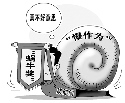 机关单位及相关人员办事效率低,在江苏泰州就有可能领到让他们红脸出汗的“蜗牛奖”。13日,江苏省泰州市效能办向社会公布了首批“蜗牛奖”认定结果,12个市直机关、基层站所榜上有名。当地效能办表示,“蜗牛奖”涉及的问题将被严肃处理、跟踪督办。(4月13日新华网)