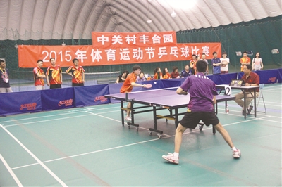 乒乓球比赛:6月28日,丰台园区2015年体育运动节乒乓球比赛在丰台科技园主题公园乒乓球馆举行。经过一天激烈的角逐,比赛结果终于揭晓。北京丰科园商务服务有限公司获得男子团体第一名;北京金汤蓝天防水工程有限公司获得女子团体第一名;海丰通航科技有限公司获得男子团体第二名;中关村科技园区丰台园科技创业服务中心获得女子团体第二名;中国华电工程(集团)有限公司、北京雷音电子技术开发有限公司并列男子团体第三名;海丰通航科技有限公司获得女子团体第三名。乒乓球运动在园区基层有着扎实的职工群众基础,爱好比赛的既有普通员工,也有公司老总,大家运动在一起体现了园区工会会员间的和谐融洽。