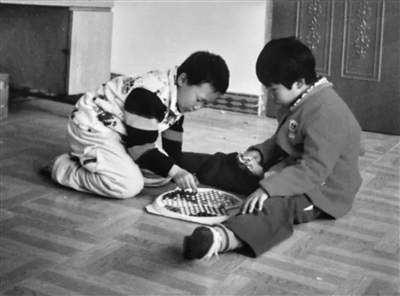 为了学下跳棋,他把自己平时积攒的零钱全买来小礼物“贿赂”给表姐。那时候的小零食种类不算太多,除了巧克力,就是小饼干,其中杏仁饼干是他表姐的最爱,所以我们经常看到表姐手里握着一包饼干和他对弈的场面。后来有一次我看到他表姐把吃剩的巧克力老往他嘴里塞,问其缘由才得知,原来是表姐吃腻了才给他吃的。看吧!这张照片上他表姐手里拿着的小零食,就是他贿赂表姐的证据。