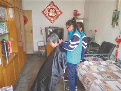 今年农历二月二一大早,社区居委会主任兼志愿服务队总队长赵俊英就敲开了赵喜印大爷的门,“大爷,我们是来给您理发的。”
